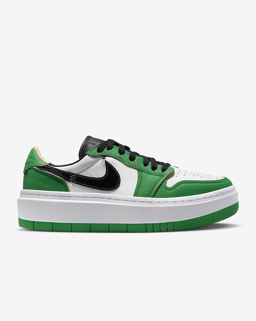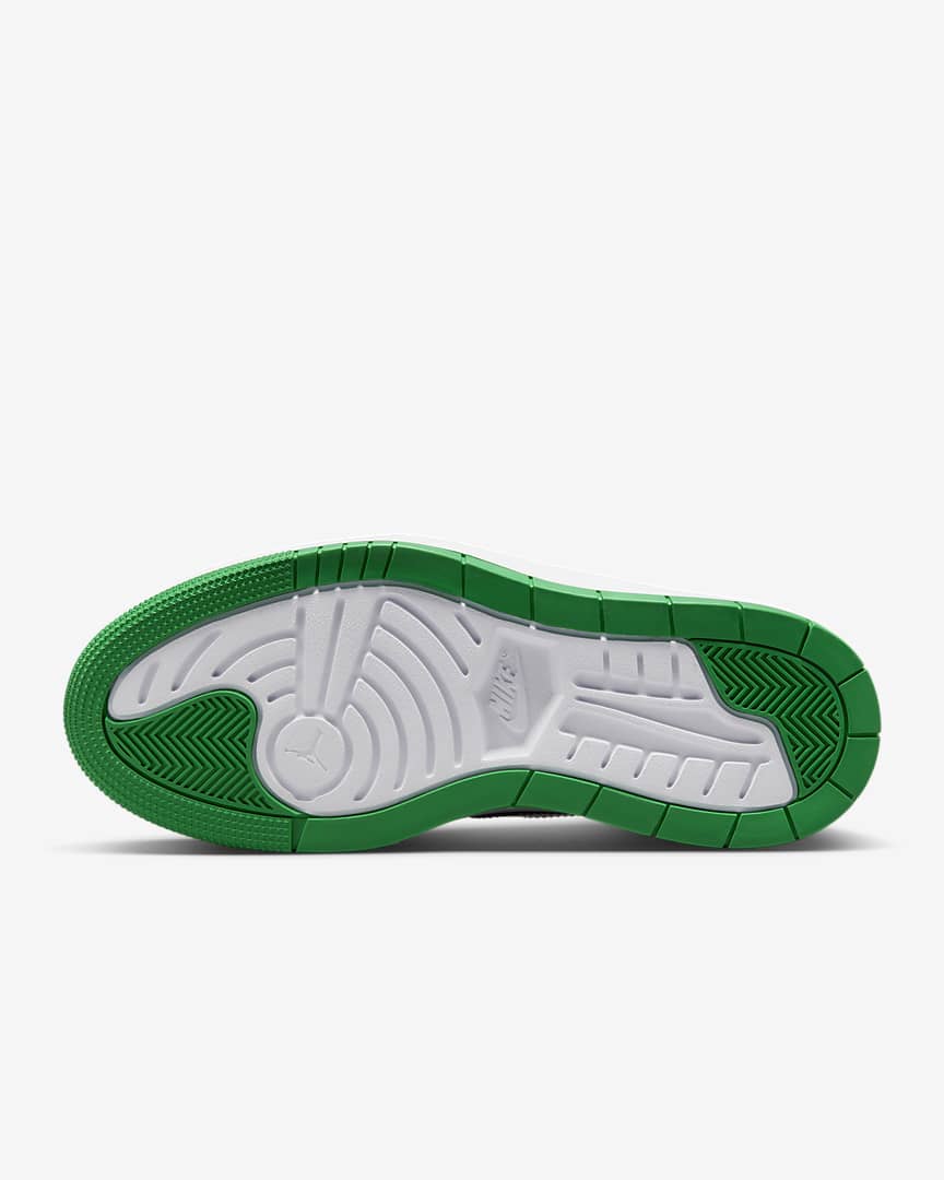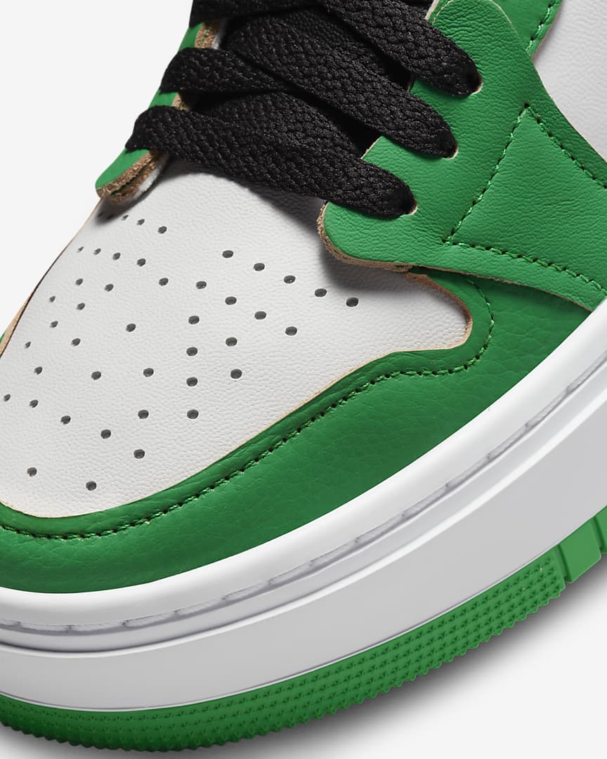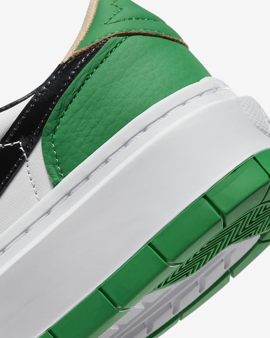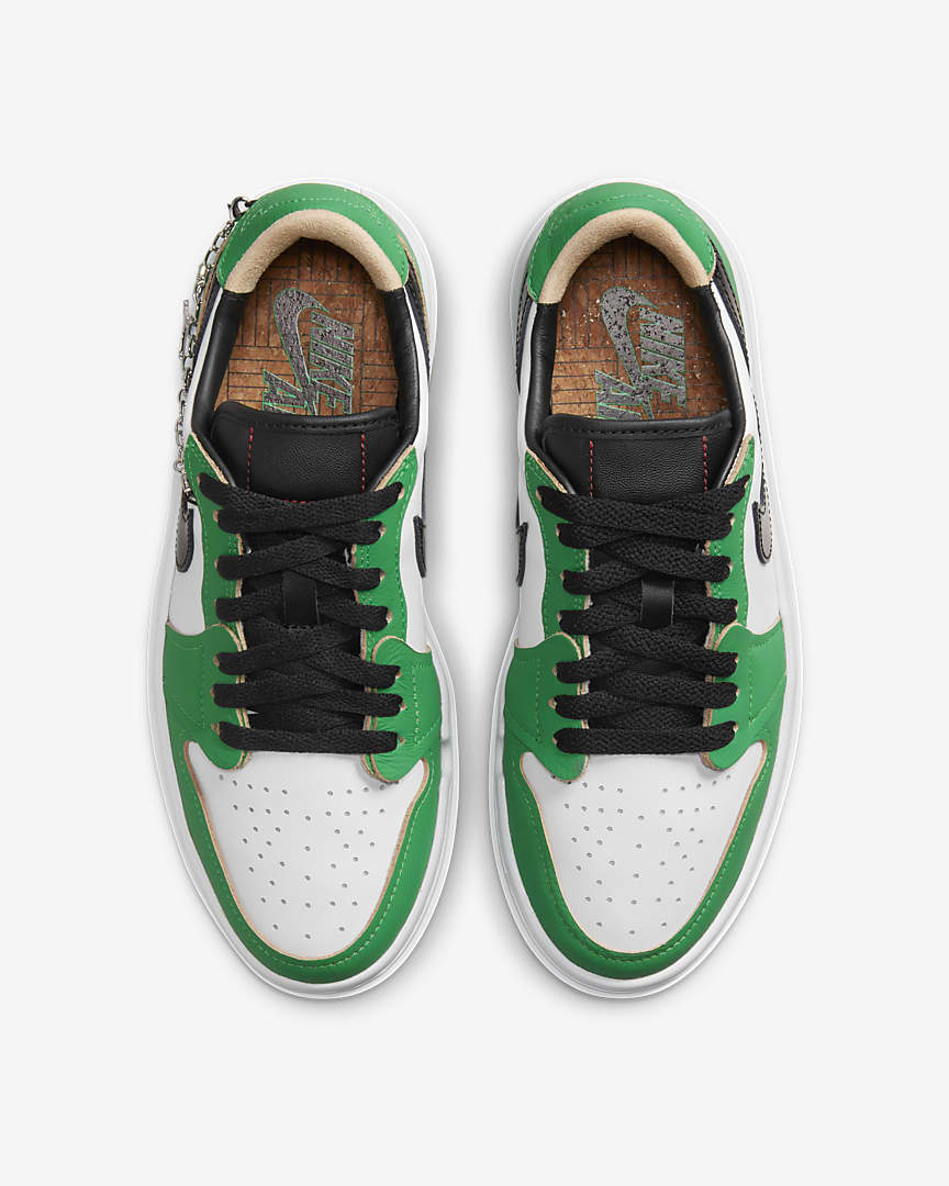 Every day is about to be your lucky day. Reworking the AJ1’s original magic, this edition makes a stylish statement with a platform stance and low-cut collar. Raw-edge leather and a clover-inspired colourway make ’em the perfect complement to any ‘fit. And the metallic charm chain nods to MJ’s legendary playoff performance in ’86—a blingy ode to greatness.